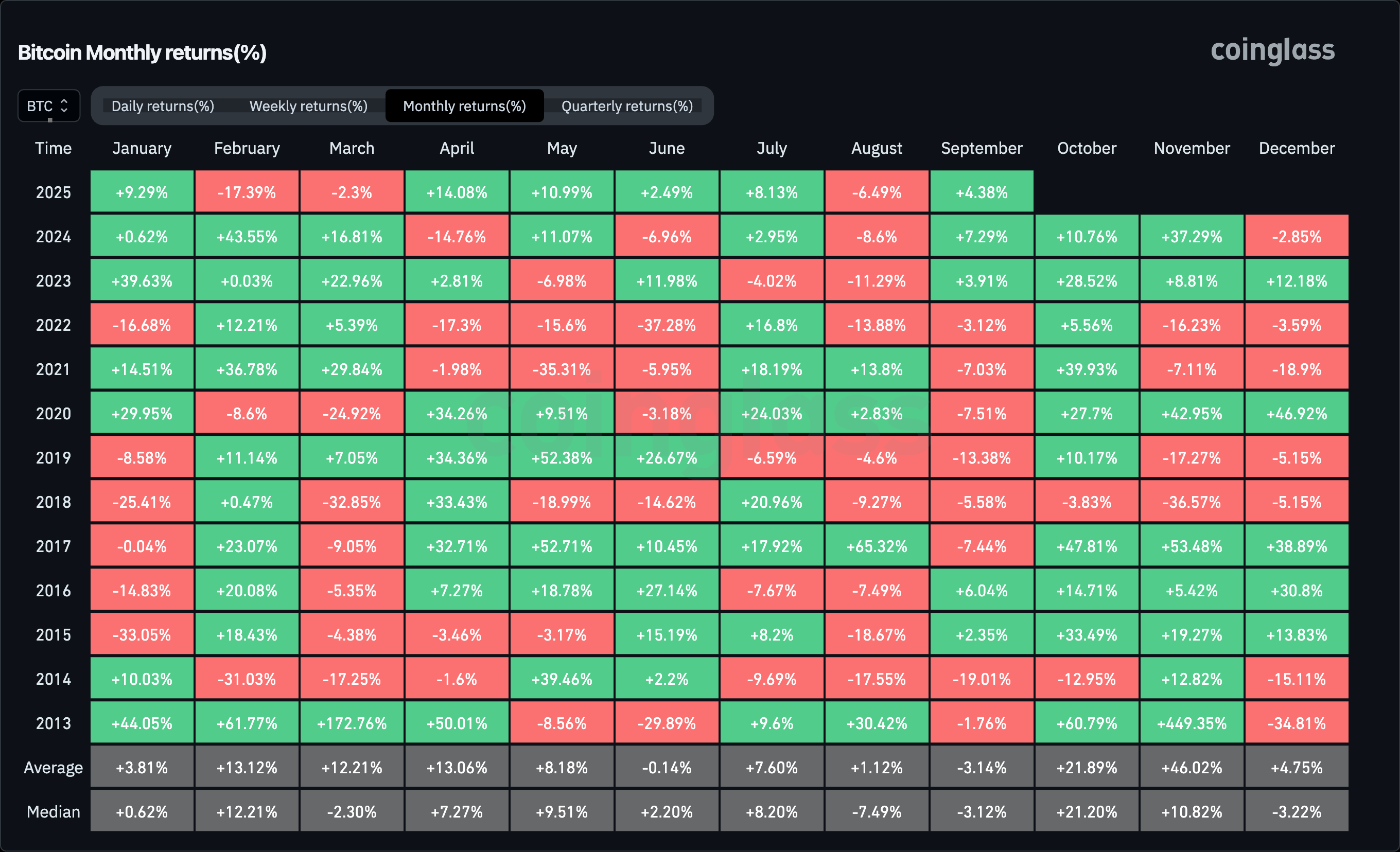 Octubre vuelve a escena con un apodo que ya es marca registrada en el ecosistema: “Uptober”. No se trata sólo de folklore cripto. Los datos compilados desde 2013 muestran que octubre es el mes con más cierres en verde para Bitcoin, con excepciones puntuales en 2014 y 2018. En ciclos pasados, el décimo mes del año dejó avances notables: +60% en 2013, +48% en 2017, +40% en 2021 y +28% en 2023. Esa memoria colectiva alimenta el sentimiento positivo que hoy domina las mesas.